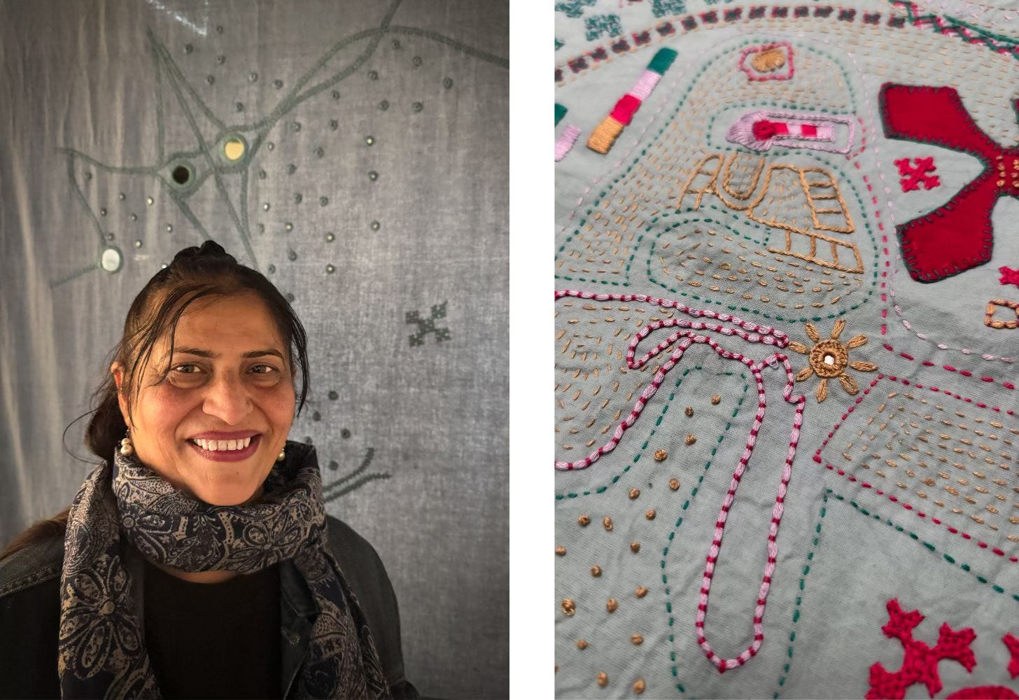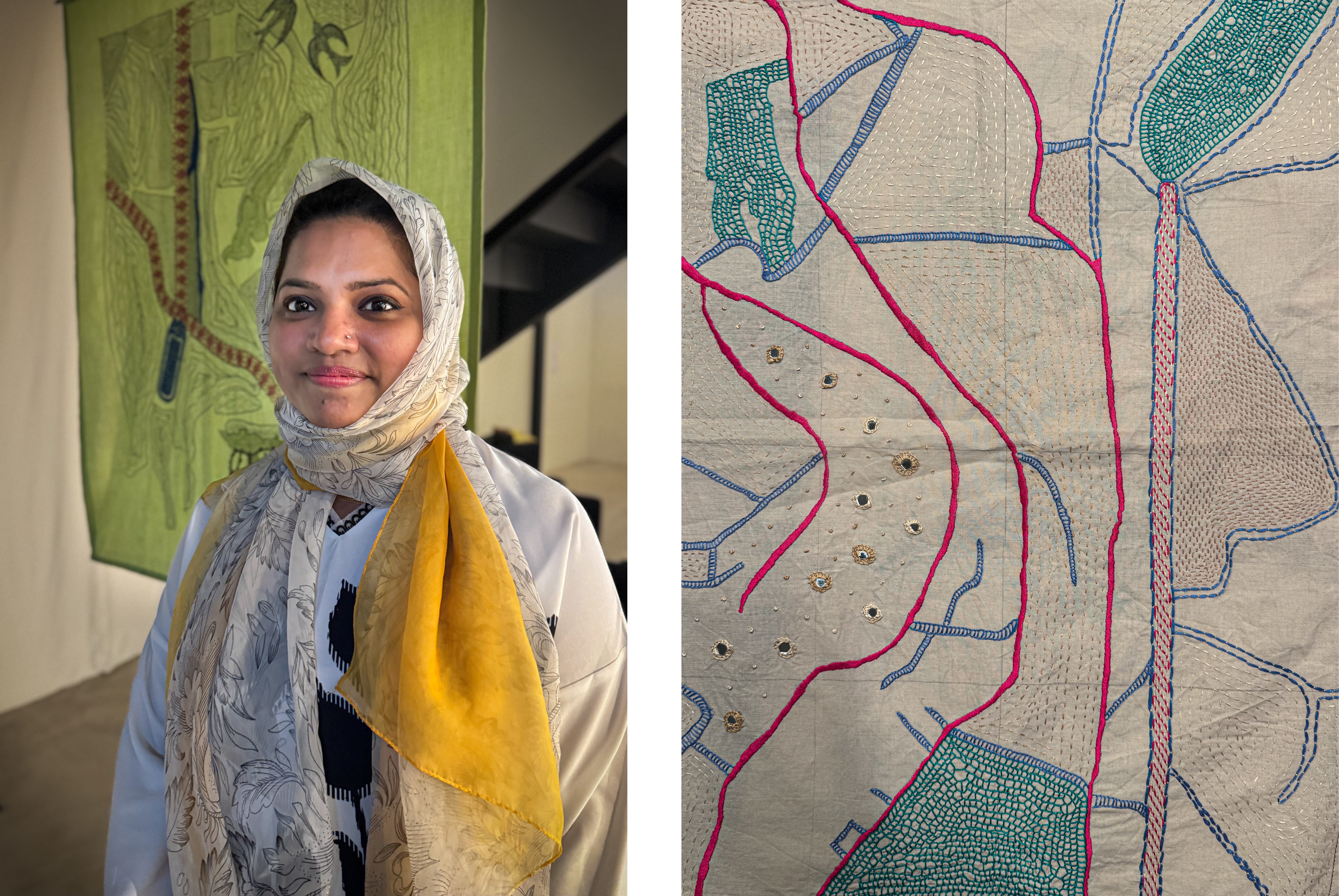 Homelore artisan Shamim Muneer alongside her locally mapped embroideries