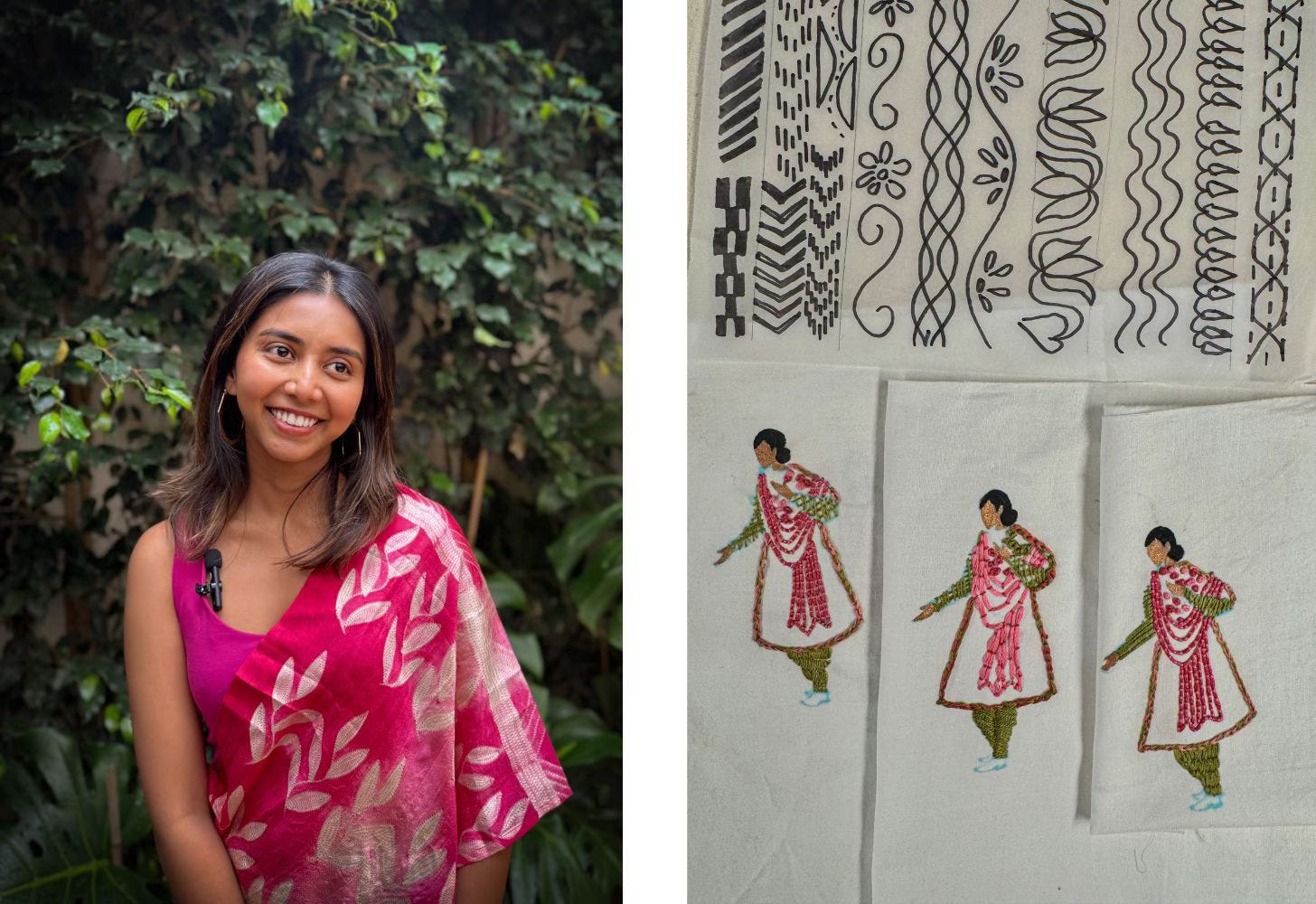 Homelore founder Riddhi Varma and embroidered ‘sketches’ by the Homelore community